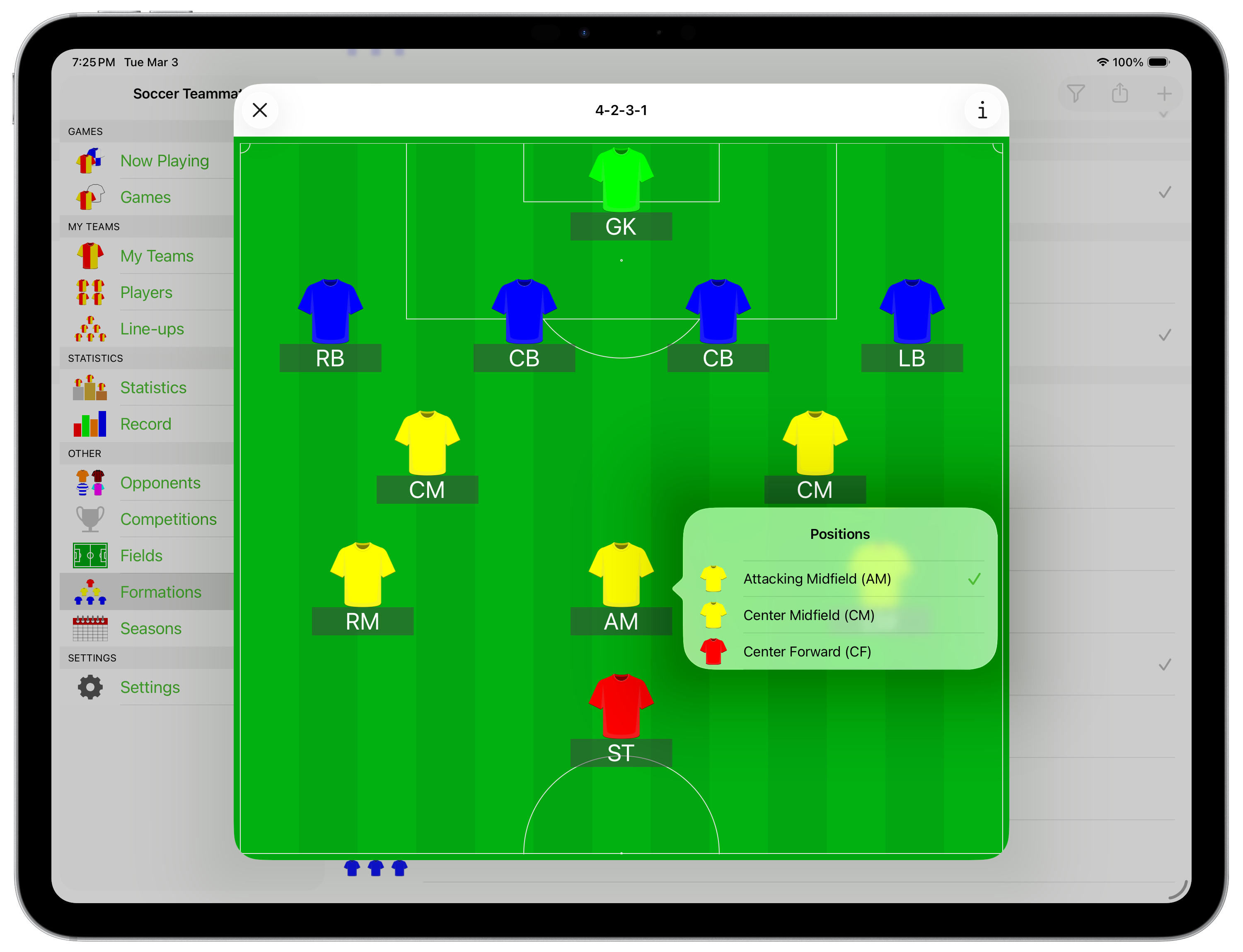 The Formations screen lists all the formations you have used and allows you to set default formations and change the name of the positions within a formation. If you use the same formation for all or most games, set it as the default.