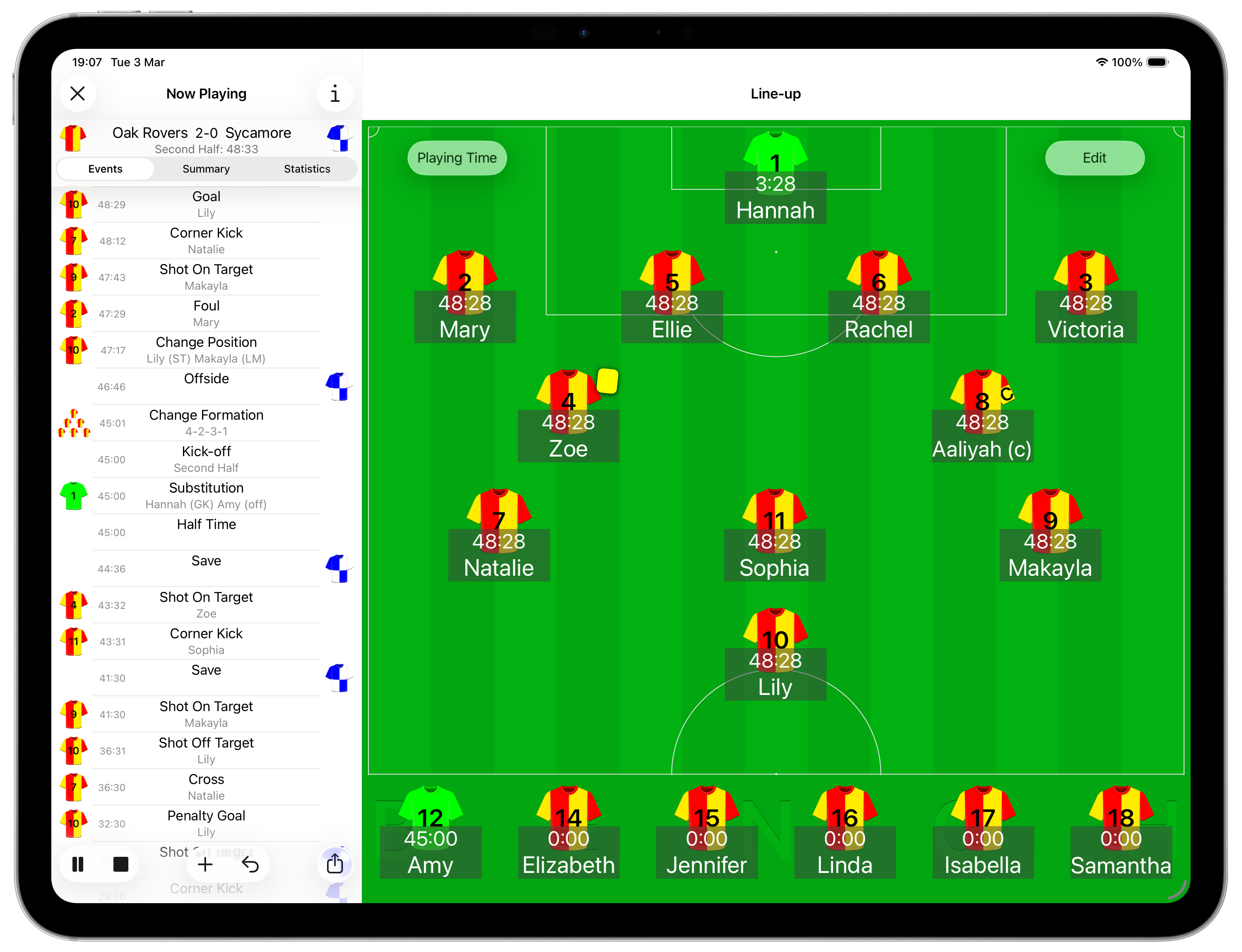 You can make adjustments to the line-up by swapping players or changing the formation at any time during the game. These changes are also recorded as game events.