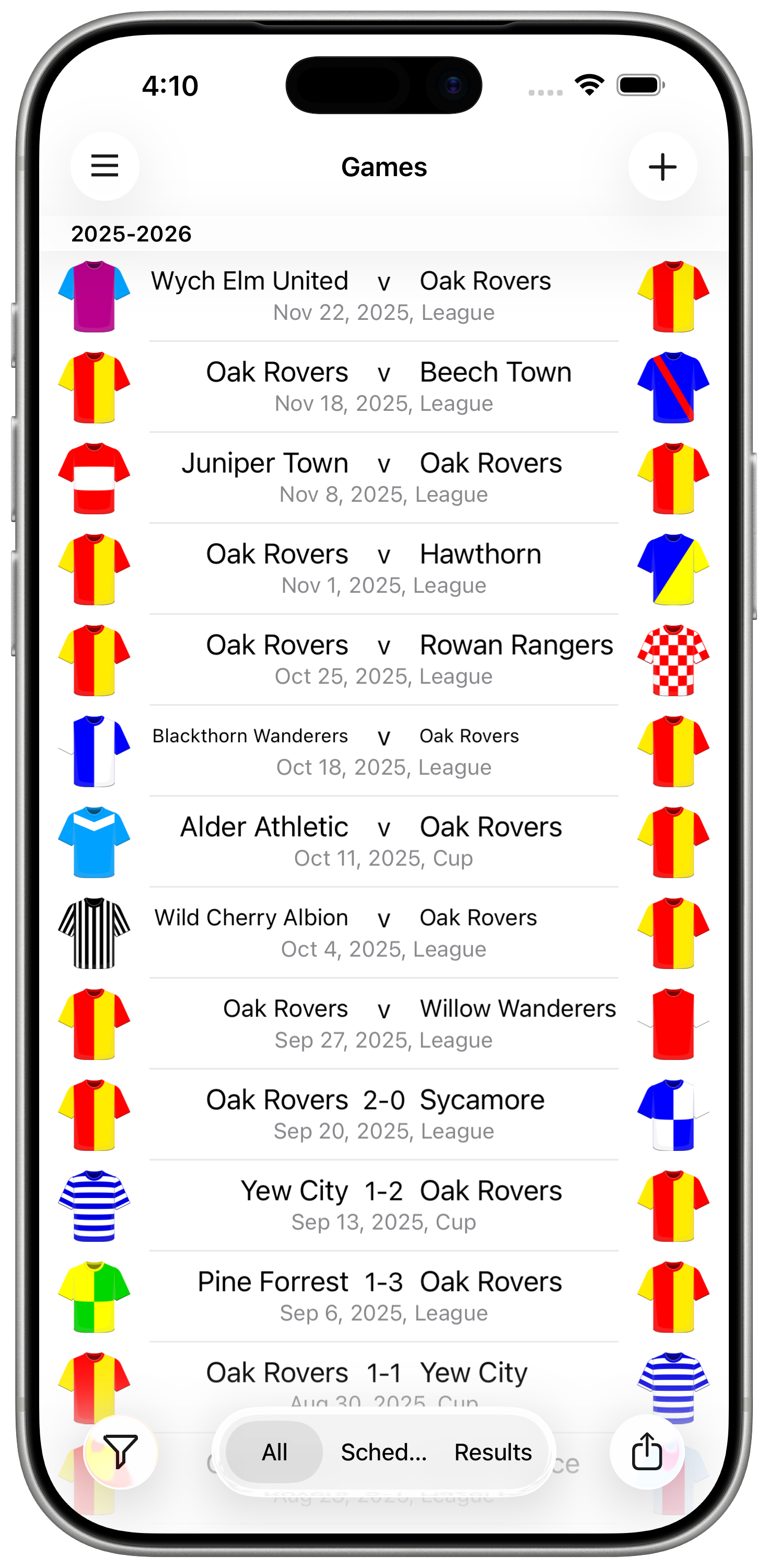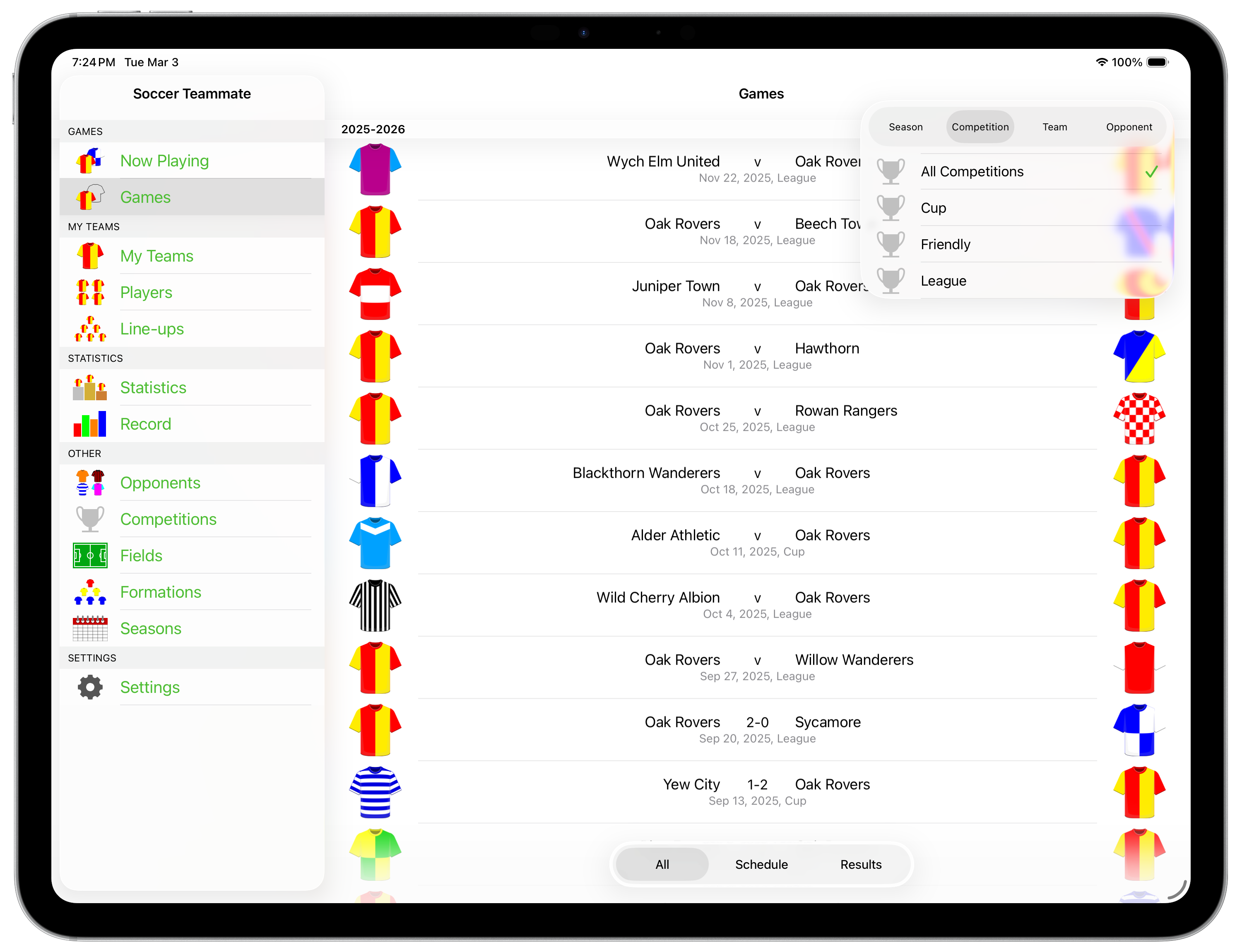 The statistics on both screens can be filtered by competition, team, opponent and season. To do so, tap the filter (funnel) button and select the items you want to filter by. Note that this filter is also applied to the list of games displayed in the 'Games' screen.