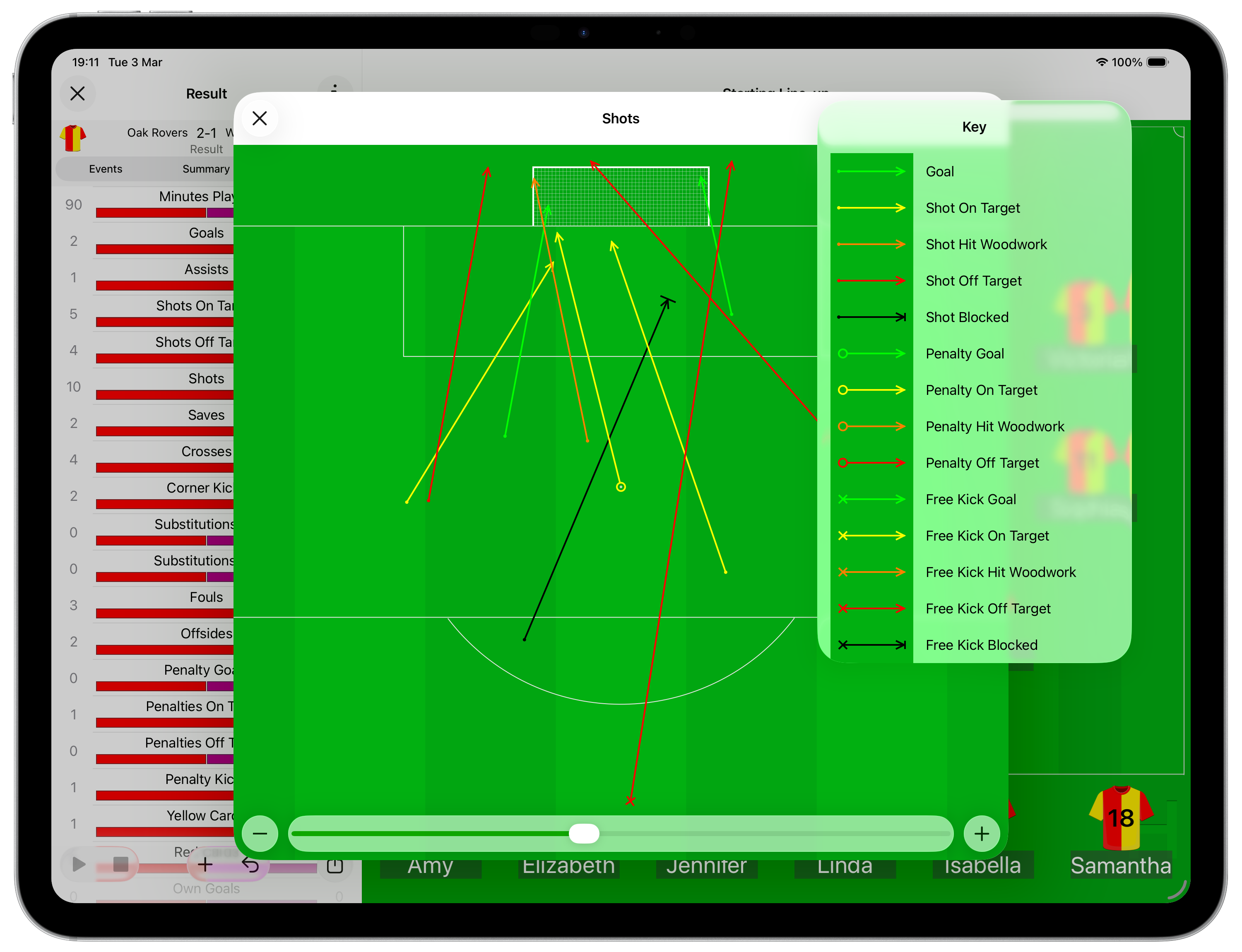 The pitch location and destination, either in the goal or missing the goal, can be recorded for all shots.