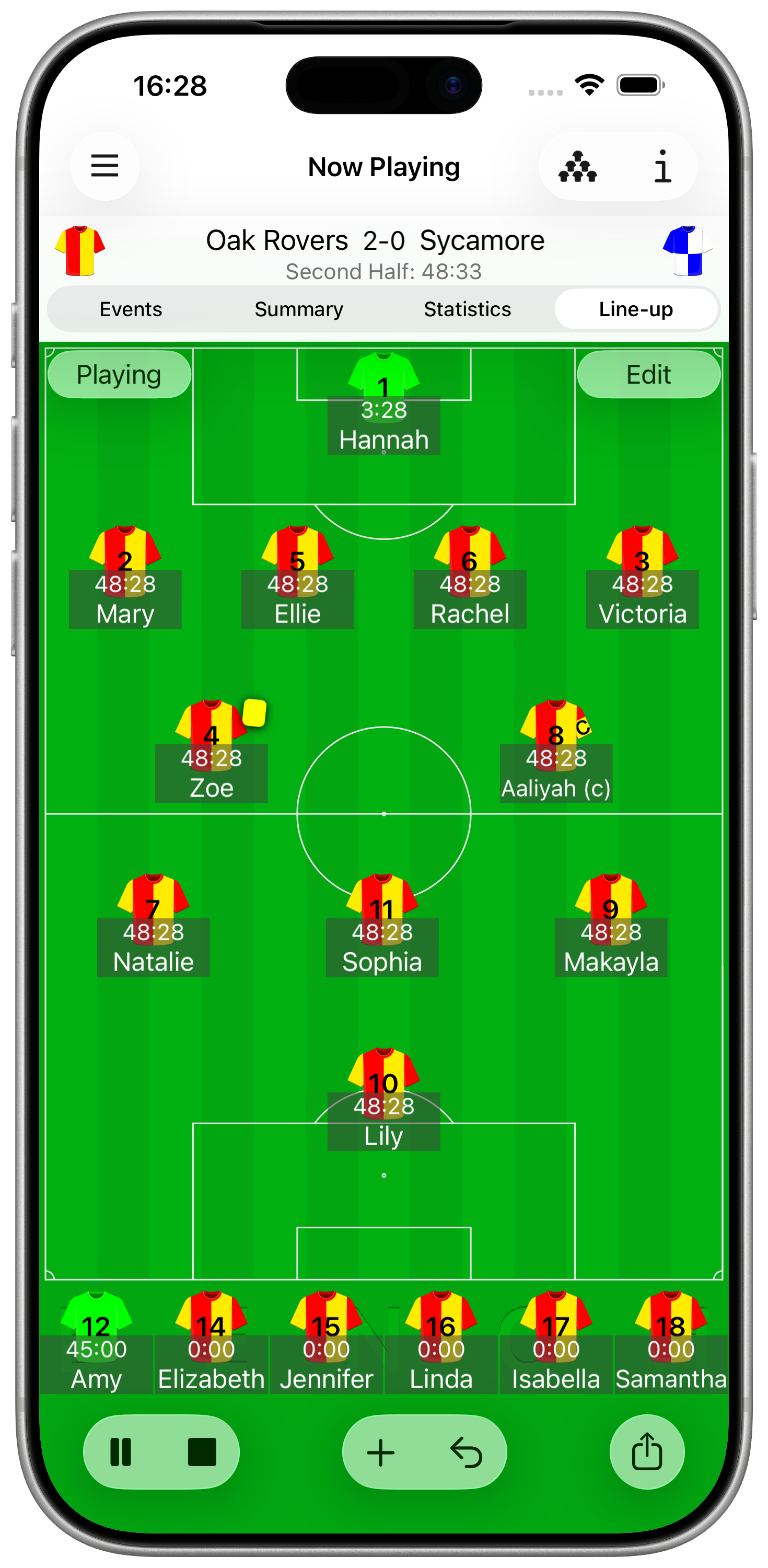 Once all the players are added tap the play button to start the game. You may get a warning if all players or substitutes have not been selected. Note that you cannot add players once the game has started.