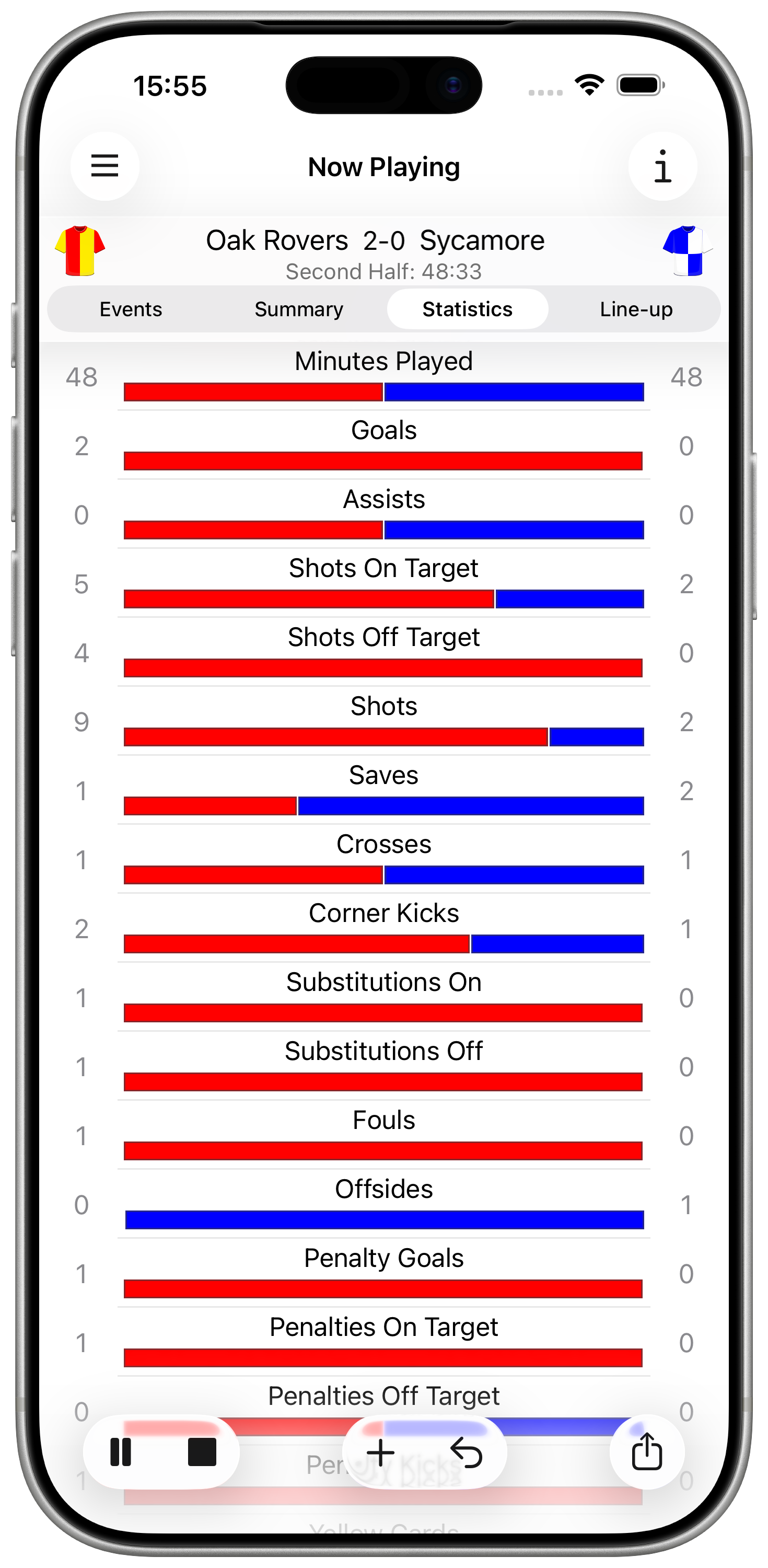 The start and end of each period is recorded using the play and stop buttons respectively. The game can be paused at any point using the pause button and then resumed using the play button.