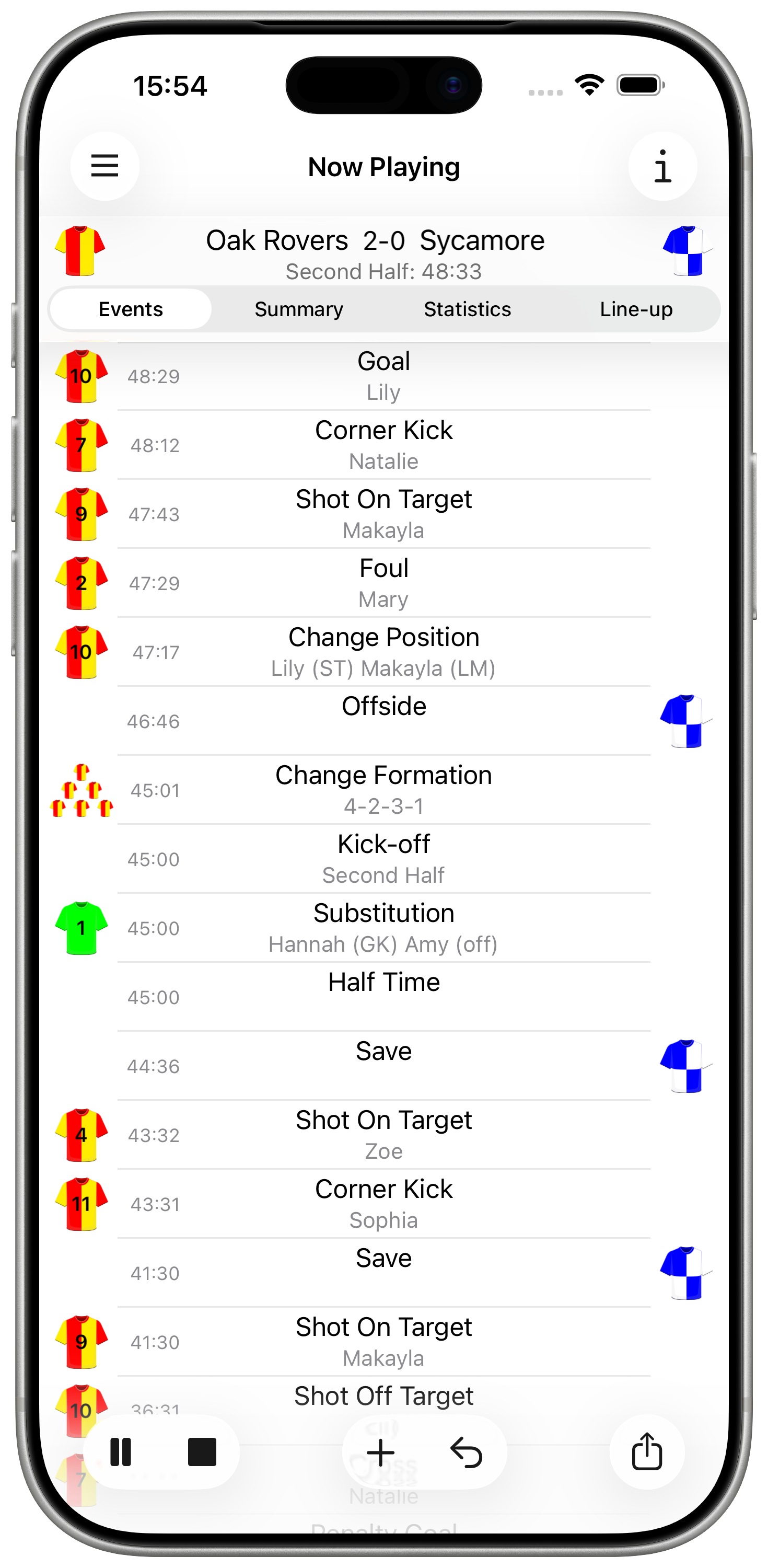 To record an event tap the player associated with the event and then select the type of the event. Alternatively tap the '+' button at the bottom of the game screen. Select the type of event and the team by tapping on the appropriate player (team) button. If the event is for your team, you can also select the player (or players in the case of a substitution).